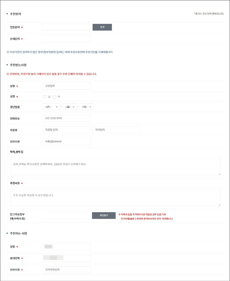 국민추천제 홈페이지에 접속하여 추천 참여하기 버튼을 누르고, 나 또는 다른 사람 중 하나를 선택하여 직위로 추천할지 전문분야로 추천할지 추천 형태를 먼저 선택한다. 그런 다음 동의 > 본인인증을 거친 후 추천 분야, 추천받는 사람 인적사항, 추천 사유, 추천하는 사람 등을 입력한 뒤 접수하면 된다.