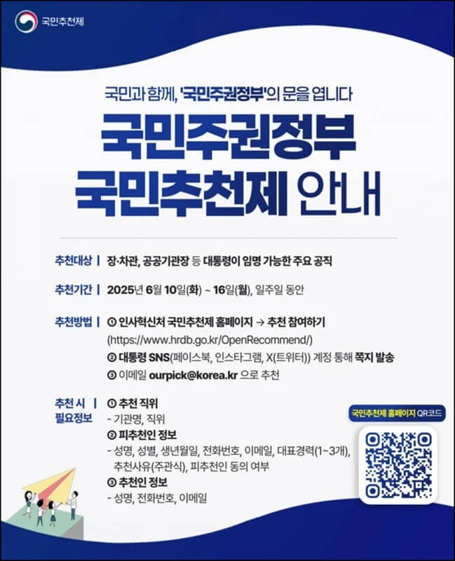 국민추천제에 참여할수있는 곳은 인사혁신처 국민추천제 홈페이지와 이재명 대통령 SNS 계정 그리고 이메일 ourpick@korea.kr로 추천하면 된다.