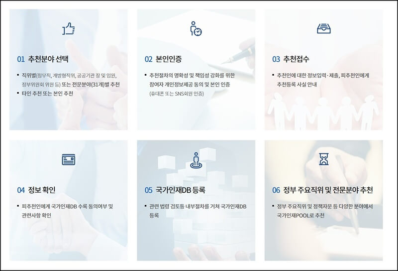 국민추천제는 추천 분야를 먼저 선택하고, 본인인증을 거친 후 추천인에 대한 정보 입력 및 제출을 하고, 피추천인에게 국가인재 DB수록 동의 여부 및 관련사항을 확인하여 국가인재 DB로 등록한 후 정부 주요 직위 및 정책자문 등 다양한 분야에서 국가인재 POOL로 추천된다.