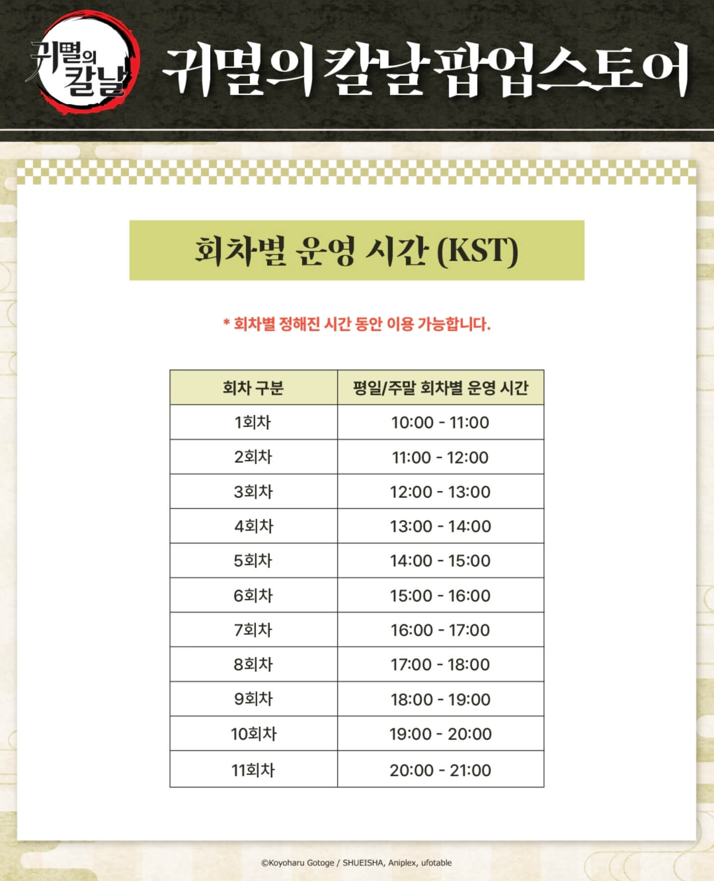 귀멸의 칼날 팝업 스토어는 매일 오전 10시부터 오후 9시까지 회차별 입장으로 운영되며 자유롭게 체험할수 있다.