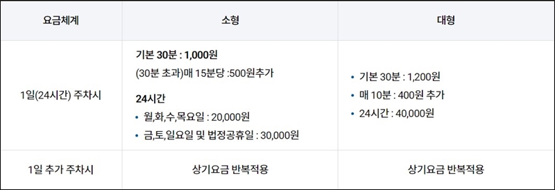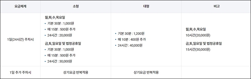 먼저 국내선 제1주차장, 제2주차장 주차요금은 요일에 따라 달라진다. 소형차인 경우 월,화,수,목요일은 1일 주차 시 20,000원 / 금, 토, 일요일 및 법정교휴일은 1일 주차 시 30,000원의 주차요금이 발생하며 소형차인 경우 1일 주차 시 40,000원의 주차요금이 발생한다.