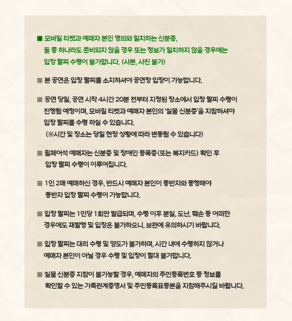 놀면 뭐하니 우리들의 축제 티켓이 무료인 만큼 모바일 티켓과 예매자 본인 명의와 일치하는 신분증을 꼭 지참해야 하는데 만약 둘 중 하나라도 준비되지 않았을 경우나 정보가 일치하지 않을 경우에는 입장 팔찌 수령 자체가 불가능하니 주의하자.