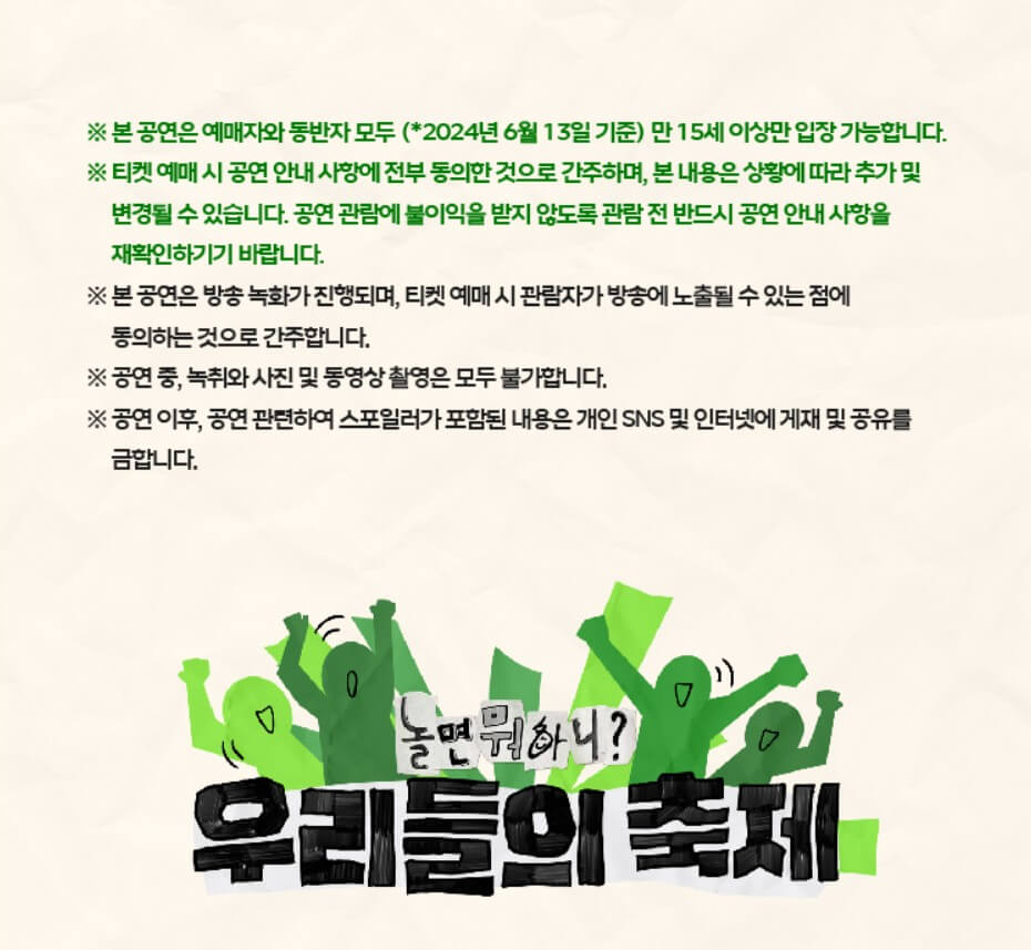하나 아쉬운게 놀면 뭐하니 축제는 만 15세 이상만 관람이 가능한 공연이다. 자녀들과 함께 가려는 분들도 계실 텐데 이점이 살짝 아쉽고 아무래도 TV 방송 프로그램에서 진행하는 축제인 만큼 방송 녹화가 진행되기 때문에 관람자가 방송에 노출될 수도 있다는 점은 알고 있어야 한다.