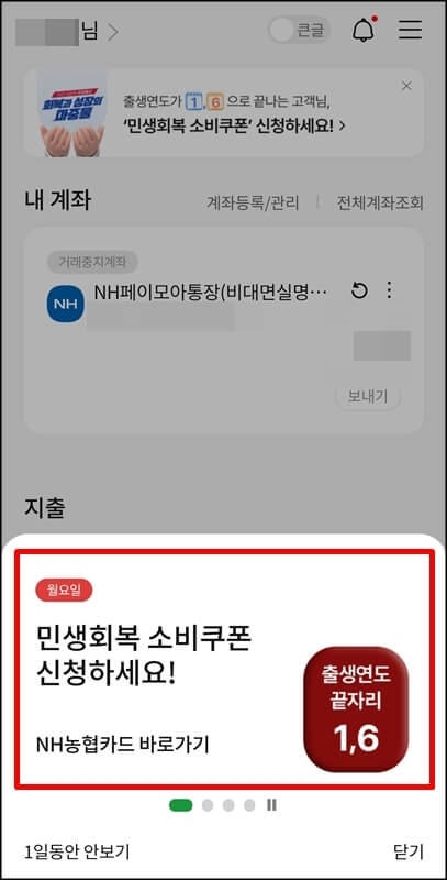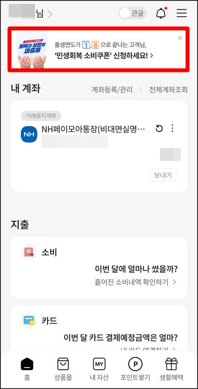 농협 체크카드 민생지원금 신청은 농협 오프라인 은행 창구와 공식 홈페이지, NH올원뱅크에서 가능한데 나는 좀 더 편리하게 NH올원뱅크 앱을 통해서 진행해봤다. NH올원뱅크 앱에 접속하고 로그인하면 메인 화면 상하단에 민생회복 소비쿠폰 신청하라는 팝업이 뜨는데 이 팝업을 뜨고 접속하면 된다.