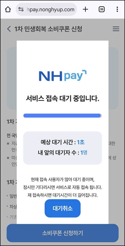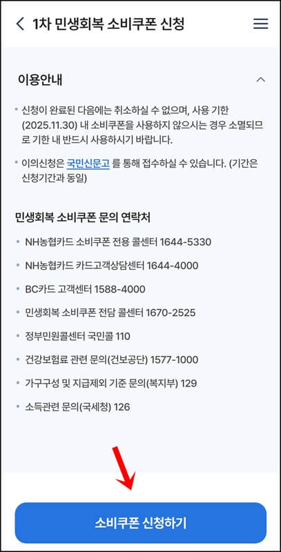 대기가 완료되면 신청할수있는 창이 오픈되는데 1차 민생회복 소비쿠폰에 대한 설명을 대충 확인하고 스크롤을 아래로 내려 소비쿠폰 신청하기 버튼을 누르고 진행하면 된다.