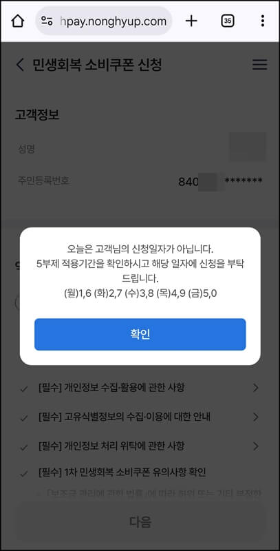 사실 나는 1984년생이기 때문에 오늘은 신청이 불가하고 목요일에 신청이 가능했으며 나처럼 신청이 불가능한 경우에는 신청일자가 아니라는 팝업을 노출시켜 준다.