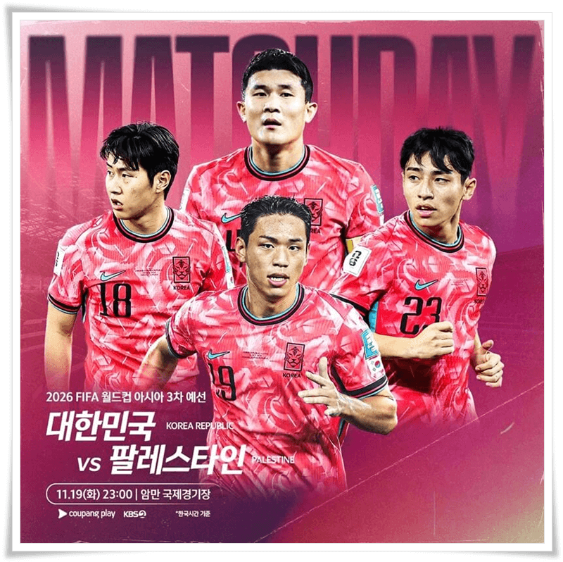 대한민국 축구 대표팀은 북중미 월드컵 3차 예선 상대인 팔레스타인과 오늘밤 경기를 앞두고 있다. 이번 경기는 올해 A매치를 마무리하는 마지막 경기로 아시아 3차 예선 B조 6차전 경기인데 대한민국 팔레스타인 축구 중계 몇 시에 하는지 알아보도록 하자.