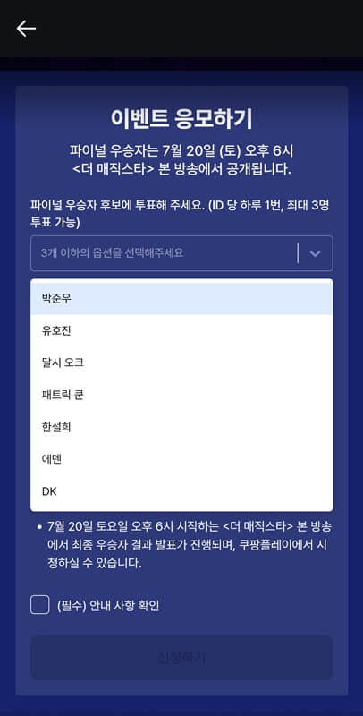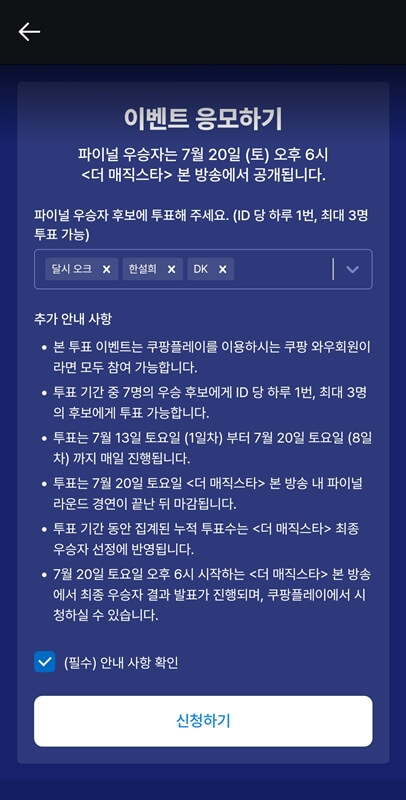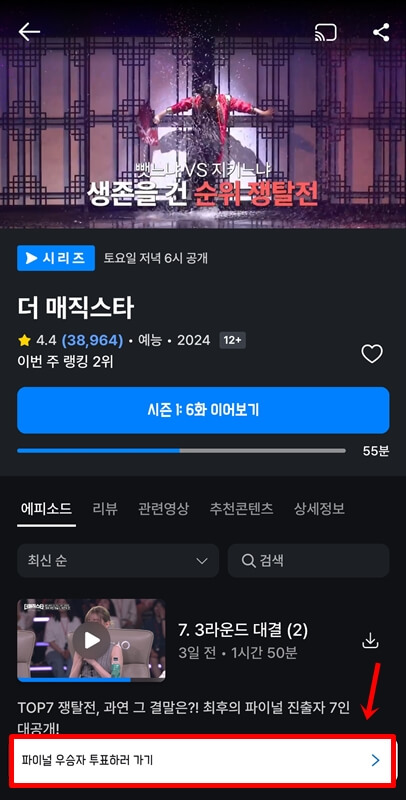 더 매직스타 파이널 우승자 투표는 쿠팡 플레이를 통해서 진행되는데 쿠팡 플레이에 접속하여 더 매직스타 프로그램을 찾아서 들어가면 하단에 파이널 우승자 투표하러 가기를 클릭하면 된다.
