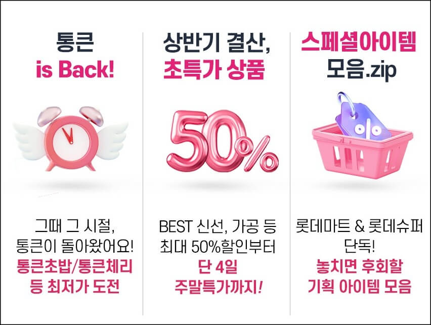 이번 통큰세일에는 앞서 말했듯이 상반기 결산 초특가 상품을 50% 할인하는 것뿐만 아니라 롯데마트와 롯데슈퍼 단독으로 놓치면 후회할 기획 아이템까지 만나볼 수 있다. 또, 롯데/신한 제휴카드로 2개 이상 결제하면 롯데/빙그레 아이스크림 전품목과 비엔나/후랑크 전품목을 30% 할인받을 수 있다.
