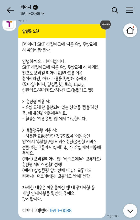 최근 skt 고객들 사이에서 유심을 새로 교체한 이후 티머니 교통카드에 충전되어 있던 금액이 사라지는 현상이 보고되었다. 이런 문제는 단말기 인증 정보와 모바일 티머니 계정이 일치하지 않아서 발생하는 상황으로 유심 교체 시 카드번호가 변경되기 때문에 반드시 재등록해야 정상적으로 사용할 수 있다.