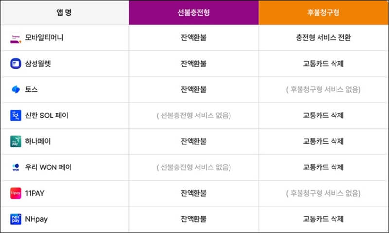 남아있는 잔액을 환불해 주는 선불 충전형 교통카드 등록 앱은 모바일 티머니, 삼성페이, 토스, 하나페이, 11 Pay, NHpay가 있고, 교통카드를 삭제하고 유심 교체 후 재등록해야 하는 후불 청구형은 삼성페이, 신한 SOL페이, 하나페이, 우리 WON 페이, NH 페이가 있다. 그런데 만약 모바일 티머니 앱에 후불 청구형으로 등록해 놓은 경우에는 충전형 서비스로 전환해야 하니 참고하자.