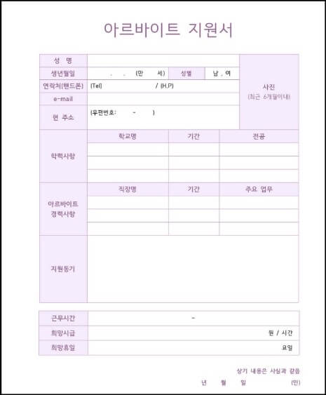 아르바이트를 할 때 필요한 이력서와 고용노동부에서 추천하는 이력서 또한 아래에 hwp 파일로 첨부해 둘 테니 필요시 다운 받아서 사용하면 된다.
