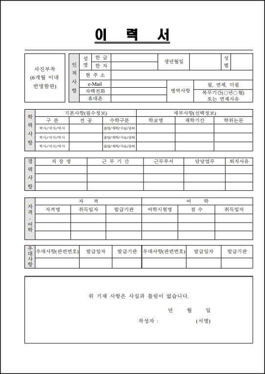 예전에 취업을 할 때는 문구점에서 이력서를 구매해서 직접 수기로 작성하곤 했는데 요즘은 깔끔하게 컴퓨터로 작성을 하는 추세인 것 같다. 물론 무료 이력서 hwp 한글 파일을 다운 받은 후 프린트해서 사용해도 괜찮다. 그럼 무료 이력서 양식 다운 hwp 한글 파일 첨부 포스팅은 여기서 끝.