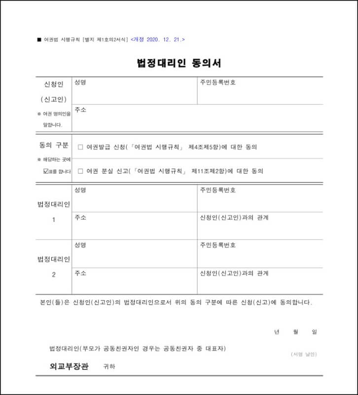 여권발급 신청서와 법정대리인 동의서는 시청에 구비되어 있지만 법정동의서에는 부모 두 사람의 정보를 모두 적어야 하니까 미리 프린트해서 적어가거나 상대방의 주민번호를 따로 적어가는 것이 좋다. 미리 작성이 필요한 법정 대리인 동의서는 첨부파일로 바로 위에 첨부해놓을테니 다운로드 및 프린트해서 사용하면 된다. (미성년자 여권발급 신청서류는 시청에 구비되어있음)