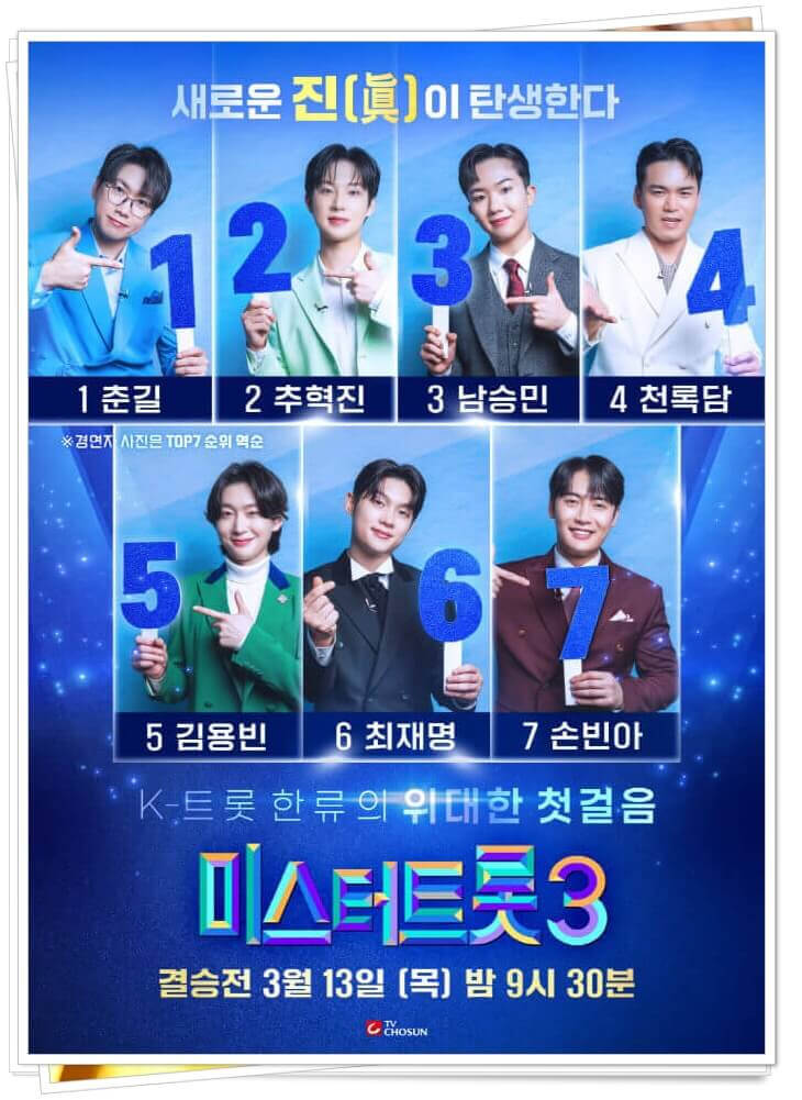 미스터 트롯3 결승전은 23년 3월 13일(목)인 오늘 밤 9시 30분부터 방송된다. 이 생방송 무대에서는 손빈아, 최재명, 김용빈, 천록담, 남승민, 추혁진, 춘길이 최후의 1인 자리를 놓고 마지막 경쟁을 펼치는데 마스터 심사 50%, 대국민 응원투표 20%, 실시간 문자투표 30%를 합산하여 眞을 선정한다고 한다.