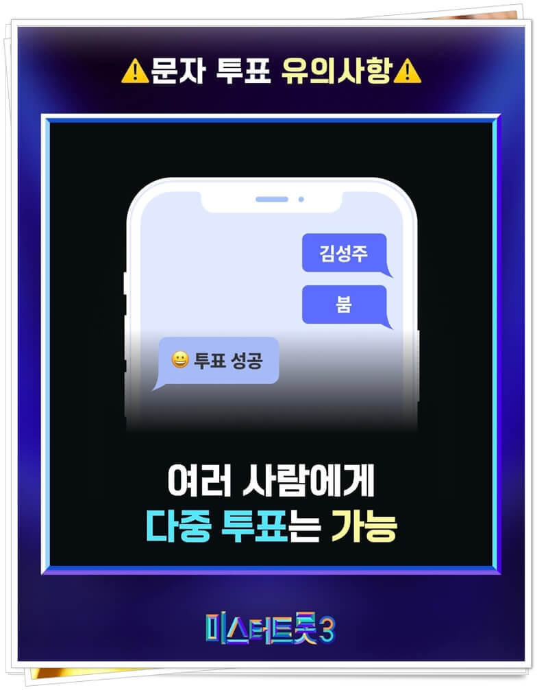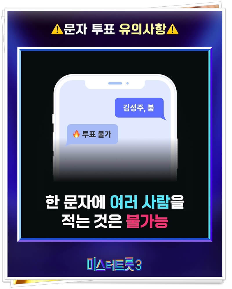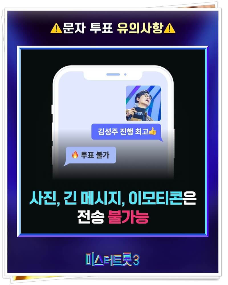 그렇게 결승전을 앞두고 공식 인스타그램에서는 미스터 트롯3 문자투표 방법과 유의사항에 대해 공지했다. 이전 시즌들과 마찬가지로 #4560 번호로 참가자 이름 또는 번호를 입력한 뒤 문자만 전송하는 식인데 이렇게만 보면 미스터 트롯3 문자투표 방법은 꽤 간단하고 단순하다. 하지만 그마만큼 유의해야 하는 사항도 있다.