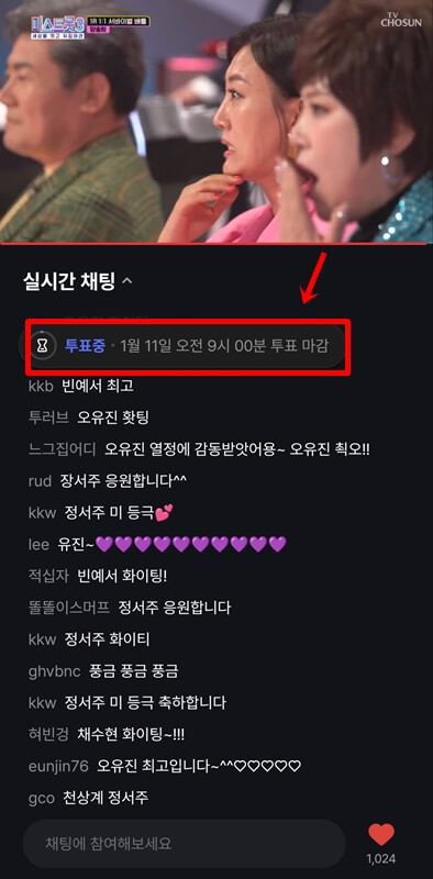그럼 이 화면에서 영상 아래 실시간 채팅창 상단에있는 투표중이라는 문구를 클릭하고 나만의 트롯스타 7인에게 투표를 진행하면 된다. 이번 미스트롯3 투표하기는 1월 11일 오전 9시까지 진행되며 다음 주 목요일에 생방송 진행 후 투표할 수 있는 주소가 새롭게 리셋된다고 생각하면 된다.