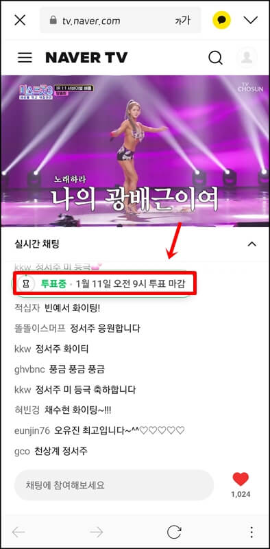 위의 미스트롯3 응원 투표하러가기를 누르고 접속하거나 네이버 검색창에 미스트롯3를 검색하고 메인 화면에 뜨는 투표하러 가기를 누르면 라이브 방송과 함께 실시간 채팅창으로 이동되는데 실시간 채팅창 상단에있는 투표중이라는 문구를 클릭하면 네이버 NOW앱 실시간 채팅창으로 자동연결이 된다.