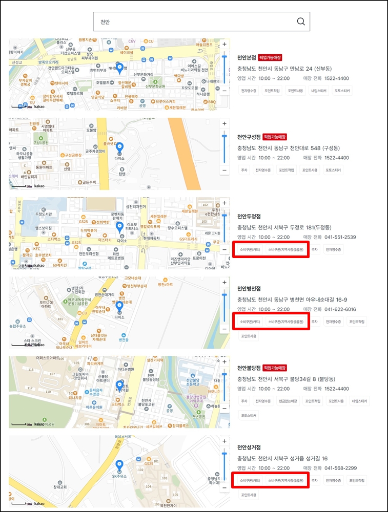 현재 다이소에서는 매장찾기 서비스를 통해서 민생회복 지원금 사용이 가능한 매장을 표기하고 있다. 방문하고자 하는 지역명 또는 매장명을 검색창에 입력하면 소비쿠폰(카드), 소비쿠폰(지역사랑상품권) 이런 식으로 표기되어 있는 가맹점들이 민생회복 지원금 다이소 사용처라고 생각하면 된다.