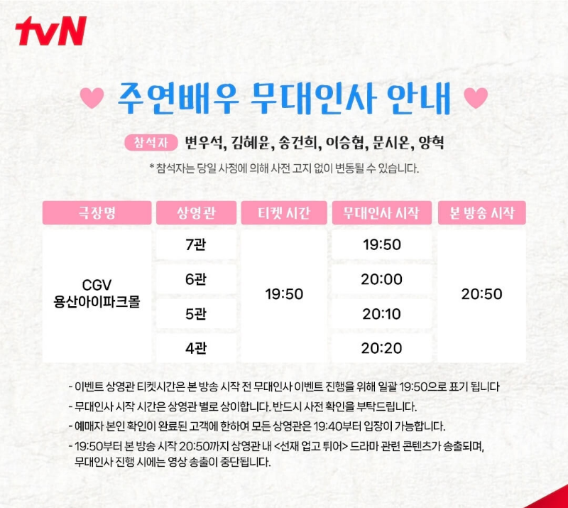 선재 업고 튀어 마지막회 단체관람은 CGV 용산 아이파크몰 4관 ~ 7관에서 이루어지는데 오후 7시 50분부터 본 본 방송이 시작되는 오후 8시 50분까지 상영관 내 드라마와 관련된 콘텐츠가 송출되고, 무대인사가 진행될때에는 영상 송출이 중단된다. 그리고 무대인사가 모두 완료된 후 본 방송을 단체관람하면 된다.