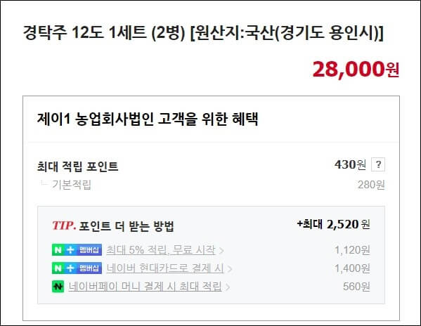 경탁주 12도 1세트에는 500ml 2병이 들어있고 이 한세트 가격이 28,000원이다. 이렇게 가격만 놓고보면 성시경 막걸리는 프리미엄 막걸리인것 같다. 그리고 한병을 먹으면 기분좋은 취기가 올라올정도인것 같은데 평소 막걸리를 좋아하는 사람들은 굉장히 좋아할것 같기도 하다.
