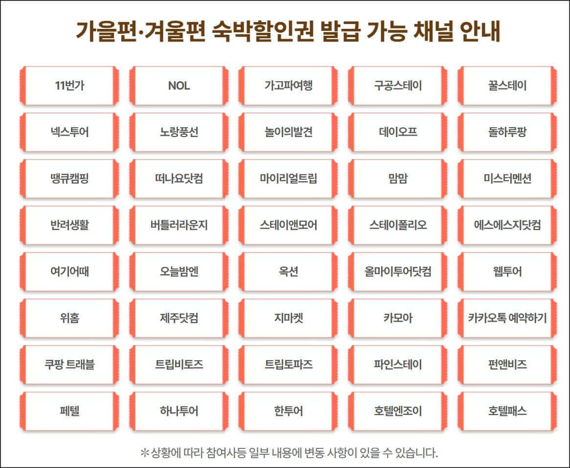 가을편은 8월 20일부터 10월 30일, 겨울 편은 11월 3일부터 12월 7일까지 쿠폰 발급이 진행되는데 특히 오늘부터 발급이 시작되는 가을 및 특별재난지역 편은 한 번에 1매만 발급되고, 겨울 편은 가을 또는 특별재난 편 사용자들도 추가 발급이 가능하다. 11번가는 라이브 커머스 채널을 통해 제주신화월드, 한화호텔, 금호리조트 등 유명 숙소도 특가로 제공하니 시간대를 잘 맞춰서 라이브 방송도 챙겨보도록 하자.