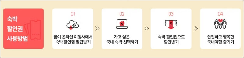 여행 숙박 할인 쿠폰은 7만원 이상 국내 숙박 상품 예약 시 3만 원 할인 쿠폰을 지급하고, 7만 원 미만 국내 숙박상품 예약 시에는 2만 원 할인 쿠폰이 지급되는데 서울, 경기, 인천을 제외한 비수도권 지역의 숙박 업소에서만 사용할 수 있다.