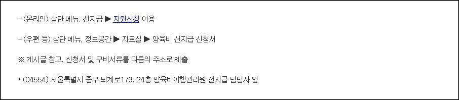 양육비 선지급제 신청은 양육비 이행관리원 홈페이지를 통해 온라인으로 신청할수 있으며 별도의 회원가입 후 지원신청 메뉴로 들어가서 신청서를 작성하고 서류를 첨부하는 방식으로 신청할수 있다. 만약 온라인 신청이 어렵다면 신청서를 작성하여 구비서류를 첨부해서 서울 중구 퇴계로 173으로 우편 발송하거나 1644-6621으로 전화상담을 안내받아 직접 방문 접수도 할 수 있으니 참고하자.
