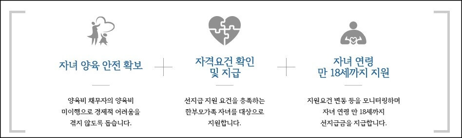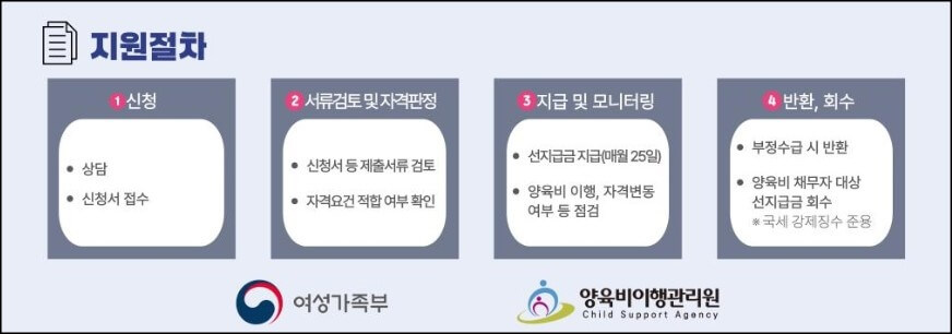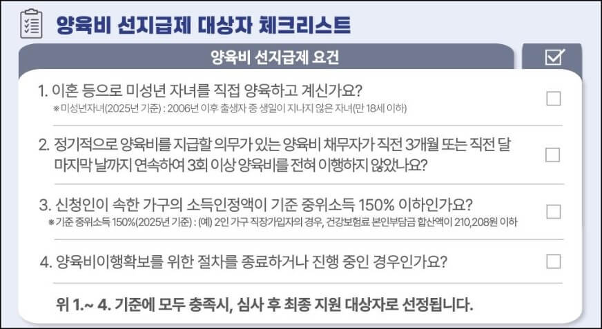 물론 양육비 선지급제 신청에는 몇 가지 조건에 부합해야 한다. 소득조건은 기준 중위소득 150% 이하이며 반드시 양육비 판결문 또는 공정증서 등 법적 근거가 있어야 신청할 수 있기 때문에 대상자 체크리스트를 참고하여 조건에 부합하는지 먼저 확인하는것이 좋다.