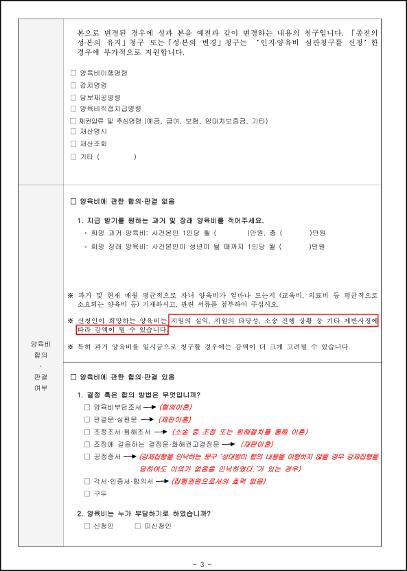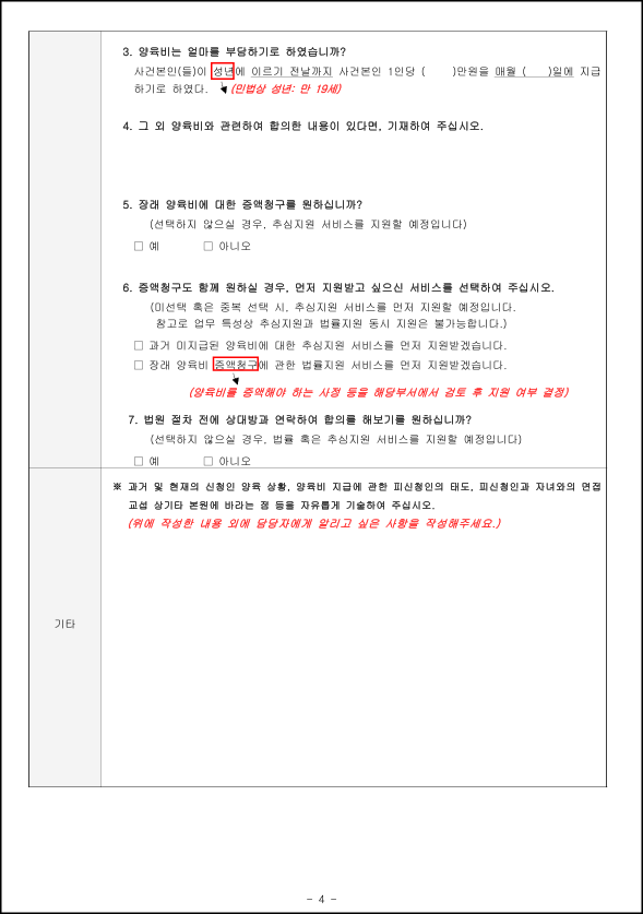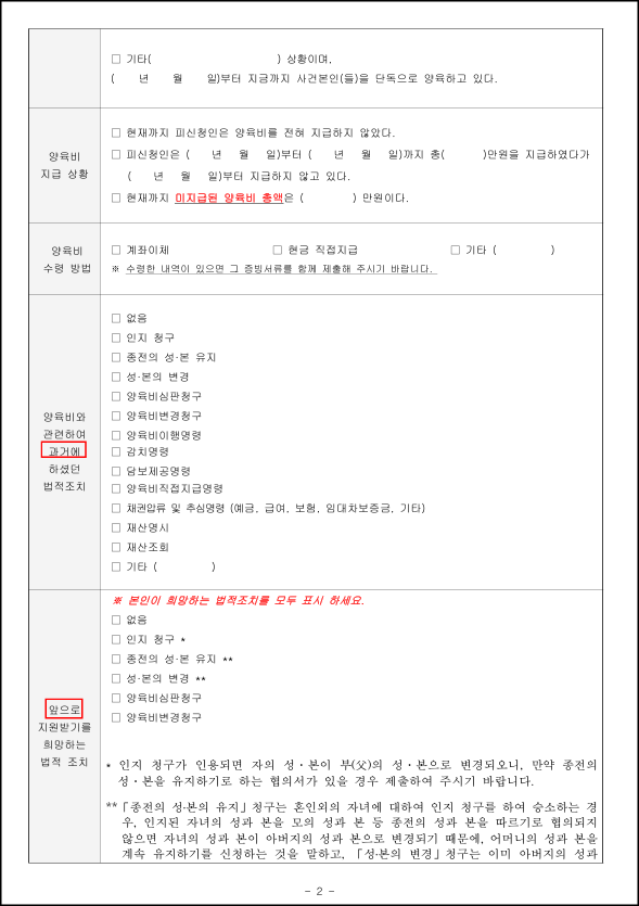 위에 첨부해 둔 파일을 다운로드하여 위의 예시를 참고해서 작성한 뒤 접수하면 좀 더 편리하게 양육비 관련 서비스를 지원받을 수 있으니 참고하자.
