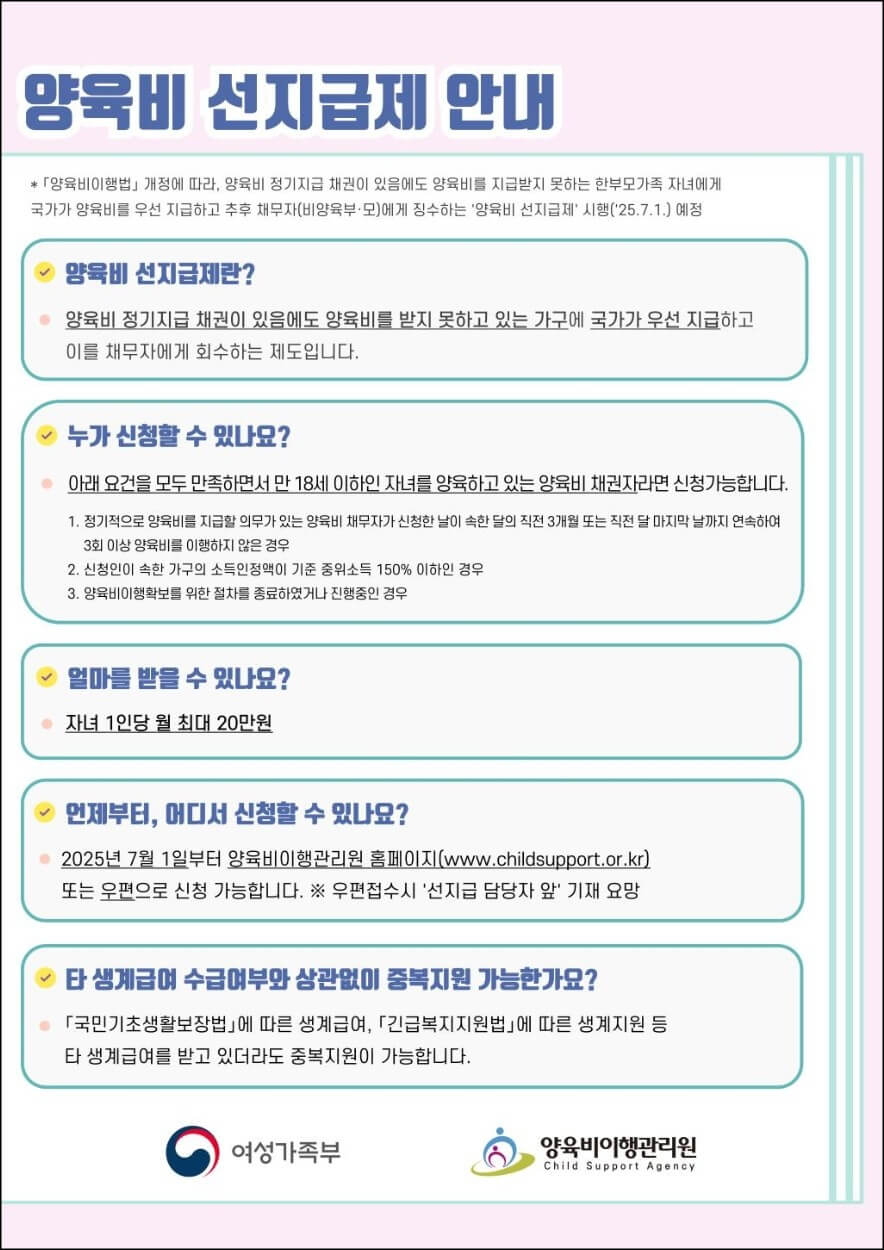 양육비를 제때 받지 못해 경제적 부담이 크신 분들을 위해 양육비 선지급제가 2025년 7월 1일인 오늘부터 본격적으로 시행된다. 이 제도는 정부가 미성년 자녀 1인당 월 20만 원을 먼저 지급하고, 나중에 비양육 부모에게 회수하는 방식으로 이번 글에서는 양육비이행관리원 홈페이지를 통한 온라인 접수 방법부터 자격 요건, 서류 준비, 궁금증 해소를 위한 FAQ까지 한 번에 정리해 보겠다.