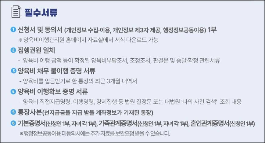 양육비 선지급제 신청을 위해서는 몇 가지 기본 서류와 입증 자료가 필요하다. 온라인으로 신청하더라도 필수서류를 스캔하거나 사진 촬영 후 첨부해야 하기 때문에 미리 준비하는 게 좋다. 위의 필수서류가 누락되거나 기준을 충족하지 못할 경우에는 승인이 지연될 수도 있기 때문에 꼼꼼하게 준비해서 접수해야 한다.