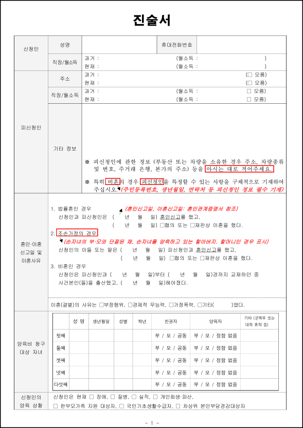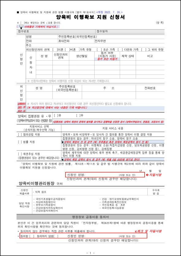 위에 첨부해 둔 파일을 다운로드하여 위의 예시를 참고해서 작성한 뒤 접수하면 좀 더 편리하게 양육비 관련 서비스를 지원받을 수 있으니 참고하자.