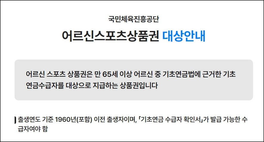 신청 대상은 65세 이상 기초연금 수급자로 지역 예산 한도 내에서 전원 선정이 가능한 경우도 있지만 예산이 초가될 경우에는 무작위 추첨으로 대상자를 선정한다. 이와 함께 본인명의 후대전화가 신청할 때 필수이며 타인 명의 전화로는 신청이 불가능하다. 또한 장애인 스포츠강좌 이용권과의 중복 수혜는 허용되지 않으니 참고하자.