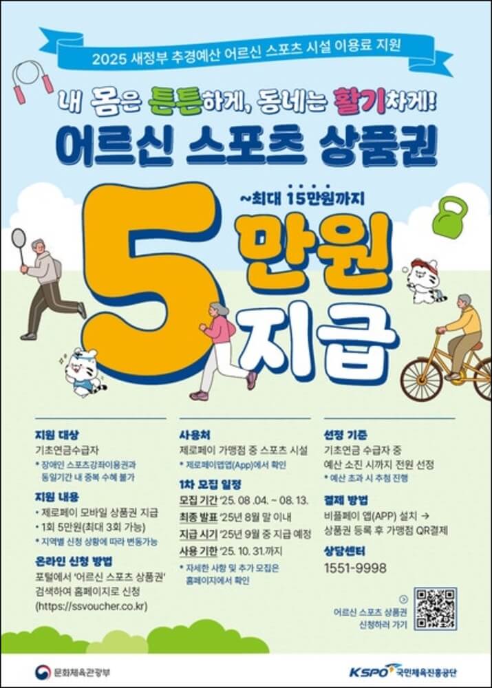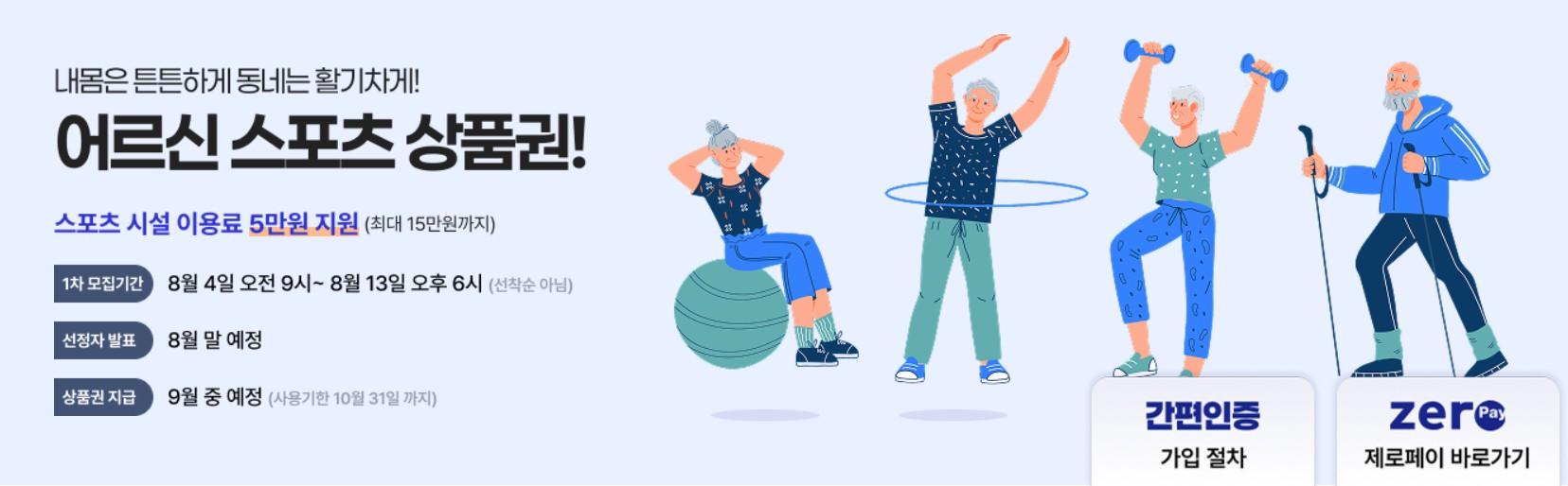 어르신스포츠상품권은 국민체육진흥공단이 추진하는 복지형 스포츠 이용지원 사업이다. 65세 이상 기초연금 수급자를 대상으로 제로페이 모바일 상품권을 제공해 지역 내 스포츠 시설 이용을 촉진하는 목적을 갖고 있다. 상품권은 1인당 5만원씩 최대 3회 즉, 최대 15만원까지 지원되며 단순한 금전 지원이 아닌 건강과 여가를 위한 실질적인 혜택을 제공하는 정책이라고 생각하면 된다.