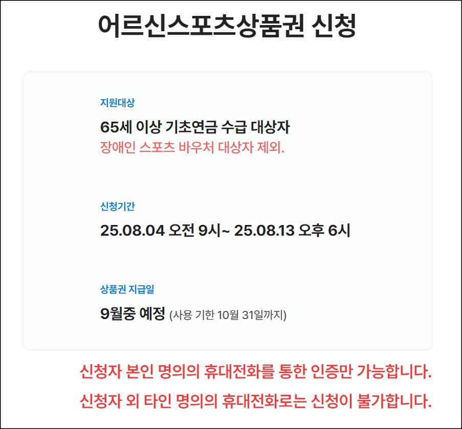 어르신스포츠상품권 신청은 2025년 8월 13일 오후 6시까지로 선착순위 아닌 무작위 추첨 방식으로 진행된다. 그리고 어르신스포츠상품권 신청방법은 기초연금 수급자 확인서에 명시된 주소지 기준으로 해야하며 어르신스포츠상품권 공식 홈페이지를 통해서만 신청이 가능하다. 해당 기간에 신청이 완료되면 8월말 이내에 최종 발표되고, 상품권은 25년 9월 중으로 제공될 예정이며 상품권 사용 마감은 25년 10월 31일까지로 정해져있다.