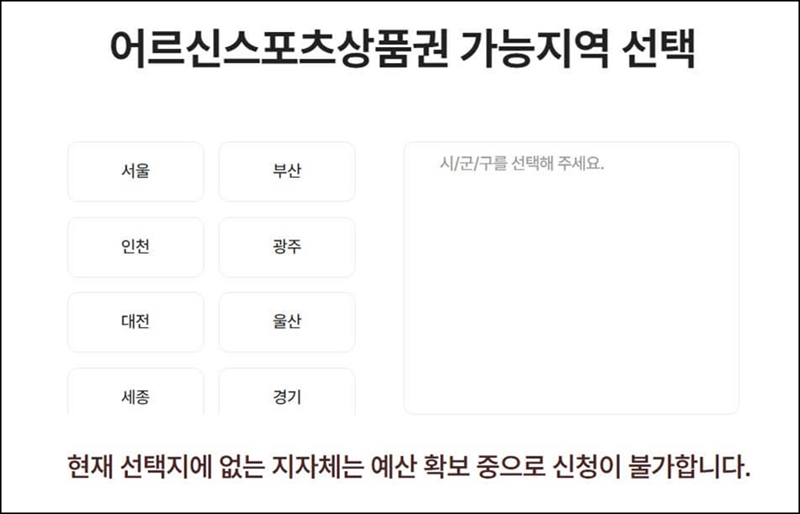 어르신스포츠상품권 신청방법은 공식 홈페이지에 접속하여 주소지를 먼저 선택한 후 신청을 하면 되는데 만약 현재 선택지에 없는 지자체라면 예상 확보 중이기 때문에 신청이 불가하다고 생각하면 된다. 주소지를 선택하고 나면 본인인증을 거쳐야 하는데 신청자 본인 명의의 휴대전화를 통한 인증만 가능하니 참고하자.