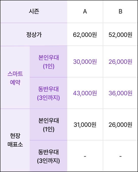 | 예약 여부 | 사전 예약 | 사전 예약 | 입장 후 당일 구매 |