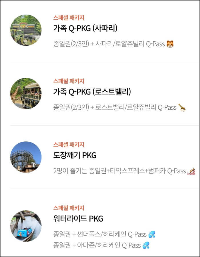 이번에는 에버랜드 큐패스 가격과 패키지에 대해 알아보자. 큐패스 패키지는 위에서 표로 말했듯이 테마별로 묶여있는 상품이라고 생각하면 되는데 사파리 패키지, 로스트밸리 패키지 등 인기 있는 어트랙션 우선 입장권이 포함되어 있는 패키지 상품이다.