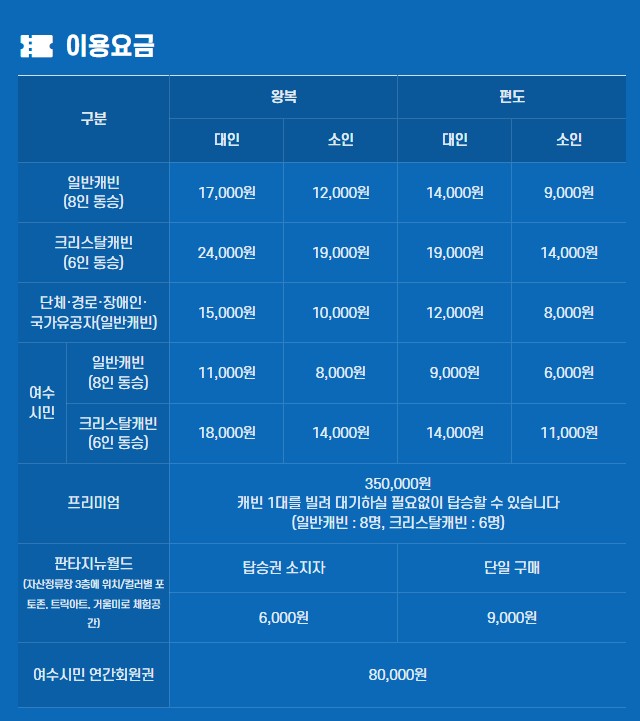여수 해상케이블카 요금은 왕복과 편도로 나누어져있고, 크리스털 캐빈은 추가 요금이 발생하며 36개월 ~ 초등학생은 소인 요금이 적용된다. 그리고 만 65세 이상과 국가 유공자 등은 증빙 시 할인받을 수 있고, 할인권은 온라인 프로모션 및 제휴카드 이용 시 추가 할인도 가능하다.