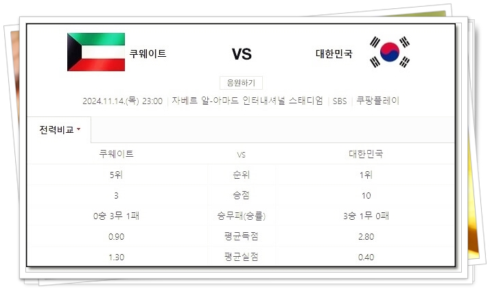 조 1위를 지키고 있지만 11월에 있을 팔레스타인전과 쿠웨이트전에서 승리한 뒤 1위를 확실하게 굳히면 더욱 좋을 것 같다. 개인적으로는 지난 2연전에서 좋은 모습을 보여줬던 배준호 선수가 이번에 선발명단에 있기를 바라며 오늘 축구 몇시? 쿠웨이트전 tv 생중계 어디서 포스팅은 여기서 끝.