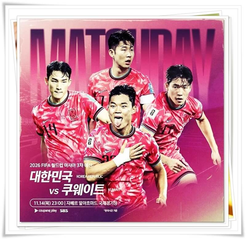 우리나라 축구 대표팀은 오늘밤 11시에 쿠웨이트와 북중미 월드컵 3차 예선 원정 경기를 갖는다. 10월에 있었던 경기에서 주장인 손흥민 선수가 부상으로 참여하지 못했는데 쿠웨이트전에서 다시 대표팀에 합류한 만큼 손흥민 선수의 출전 여부가 주목되는데 오늘 축구 몇시에 하는지 그리고 오늘 축구 tv 생중계 어디서 하는지 알아보도록 하자.