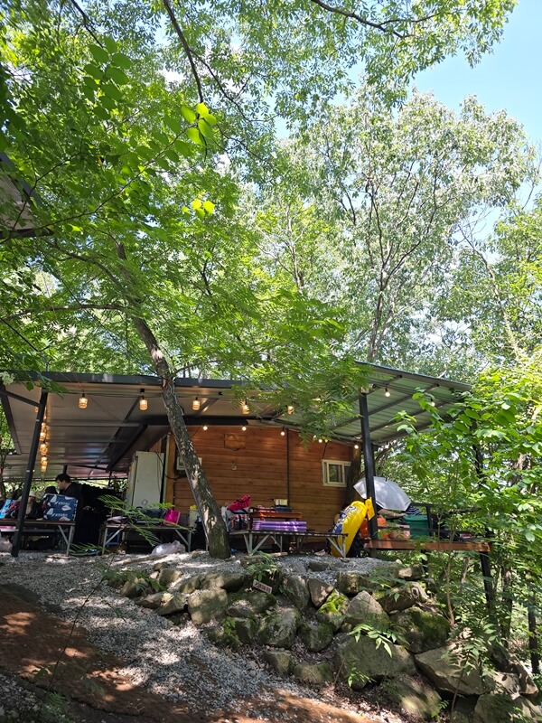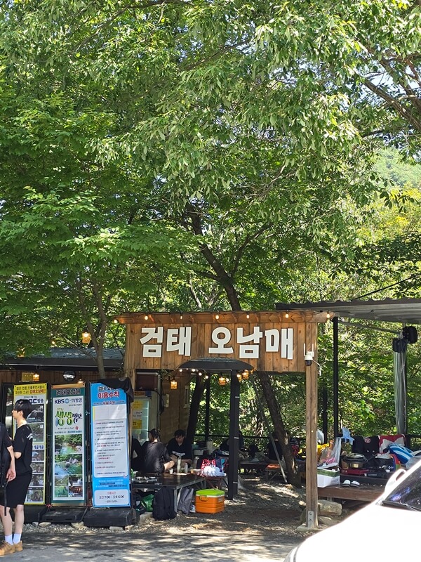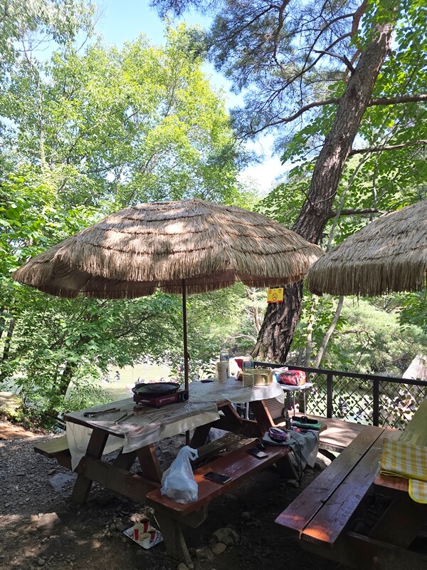 동상계곡 평상 대여 검태오남매에서 가장 좋은 평상 위치는 매점 뒤에 있는 평상과 파라솔이 쳐있는 테이블 평상이 아닐까 싶다. 우리는 오전 10시 다 되어서 도착했었는데 이미 블루라군이라고 불리는 계곡 앞의 평상들은 만석이었다.