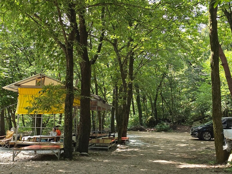 안내받은 검태오남매2는 평지 곳곳에 평상이 배치되어 있었고, 우리가 첫 타자였기 때문에 계곡 바로 앞에 있는 평상 두 개(12만 원)를 계산하고 자리 잡았다. 주차도 평상 바로 앞에 할 수 있었음. 한 개의 평상 가격이 6만 원이었고 이는 4~5인 기준이었던 것 같다.