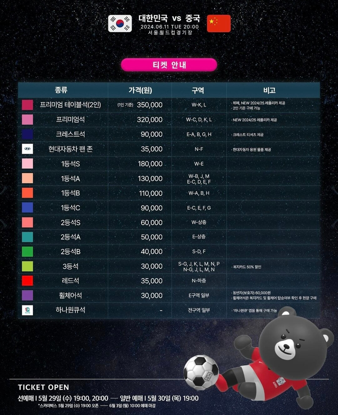 - 프리미엄-프리미엄 테이블석 : 2024-25 시즌 NEW 국가대표 유니폼 레플리카가 제공되고, 프리미엄 테이블석은 뷔페까지 추가로 제공됨.