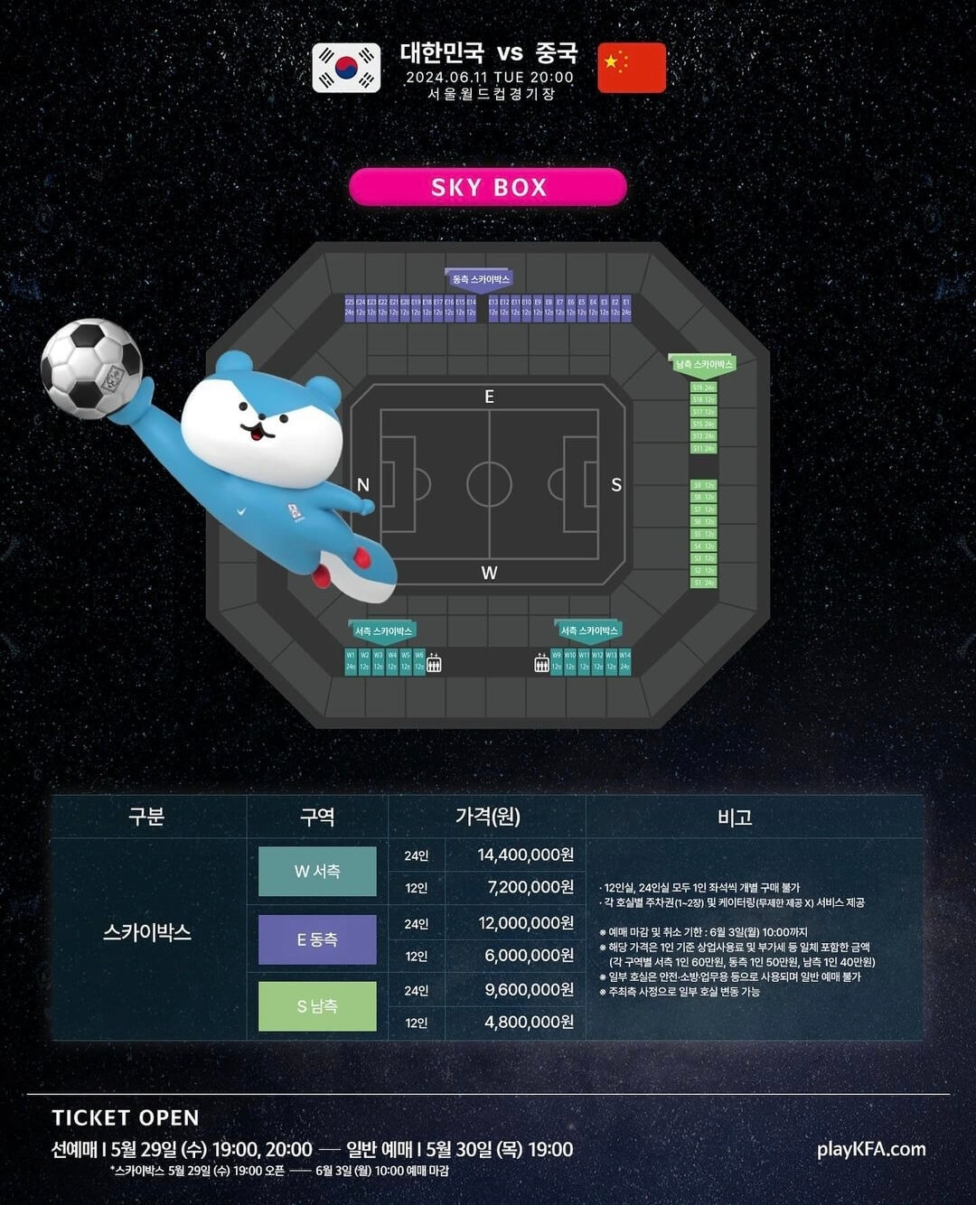 그리고 잠시후 티켓이 오픈되는 스카이박스는 호실과 인원수에 따라서 480만 원부터 1,440만 원으로 책정되어 있는데 주차권과 케이터링 서비스를 제공하고, 12인실과 24인실 모두 1인 좌석씩 개별 구매가 불가하다고 하니 참고하자.