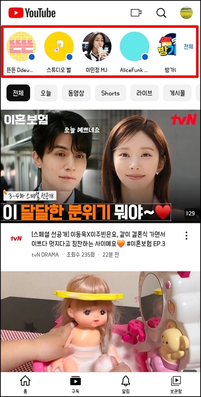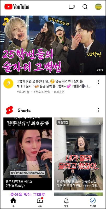 그럼 이렇게 내가 시청했던 영상들의 알고리즘이 홈 화면에 나타나고, 구독하고있는 채널들도 확인 가능하다.
