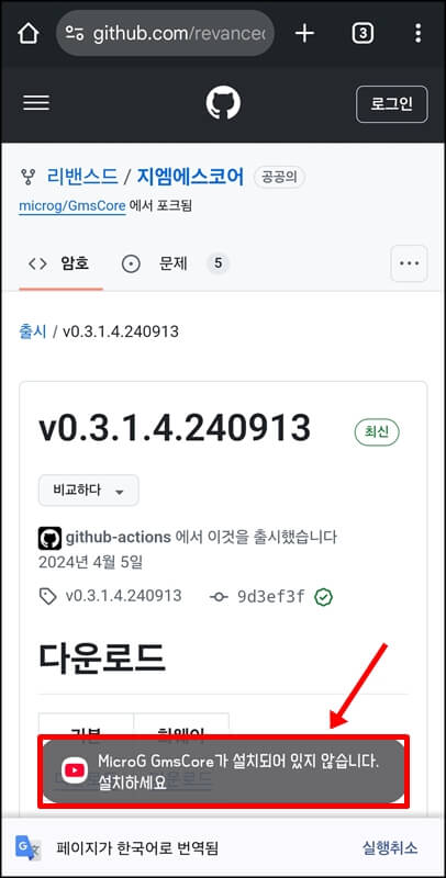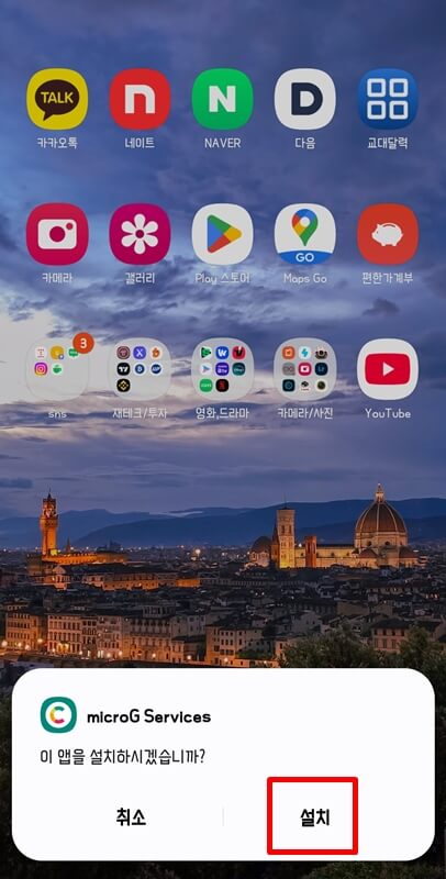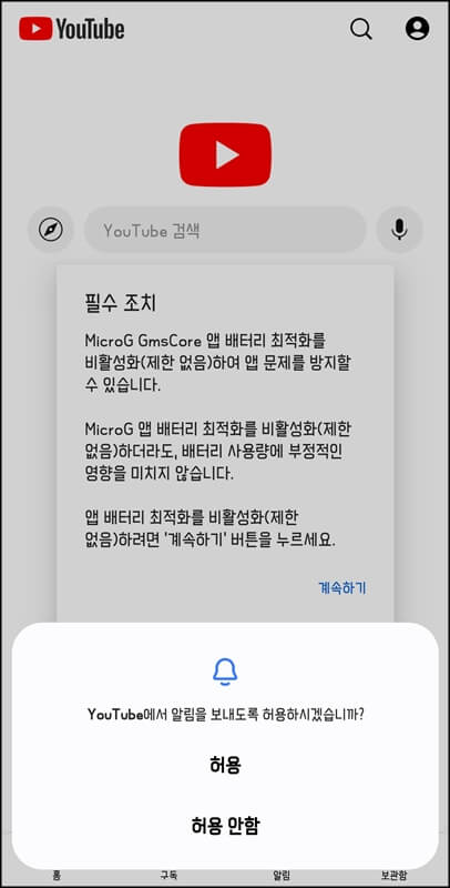 그럼 유튜브 앱을 설치하겠냐는 팝업이 뜨는데 설치 버튼을 누르고 설치가 완료되면 자동으로 MicroG 설치 화면으로 이동되면서 MicroG GmsCore가 설치되어있지 않으니 설치하라는 팝업이 뜬다.