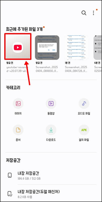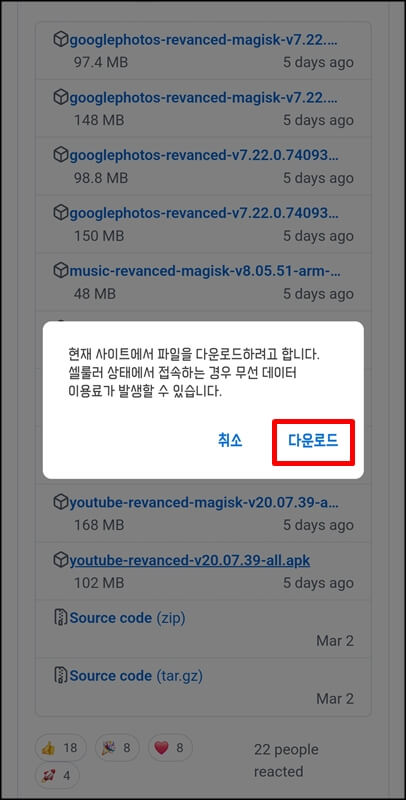 해당 유튜브 리밴스드 최신버전 apk 파일을 클릭하면 현재 사이트에서 파일을 다운로드하려고 하는데 셀룰러 상태에서 접속하는 경우 무선 데이터 이용료가 발생할수 있다는 팝업창이 하나 뜬다. 여기서 다운로드 버튼을 클릭하고, 핸드폰 내파일 폴더로 들어가서 방금전 다운로드 한 유튜브 리밴스드 파일을 클릭한다.