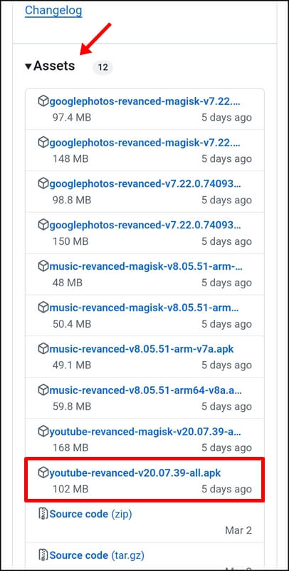 Assets 영역에 있는 유튜브 리밴스드 apk 파일을 찾아 클릭한다. 현재 포스팅하는 기준으로 유튜브 리밴스드 최신버전은 youtube-revanced-v20.07.39-all.apk 파일이다.